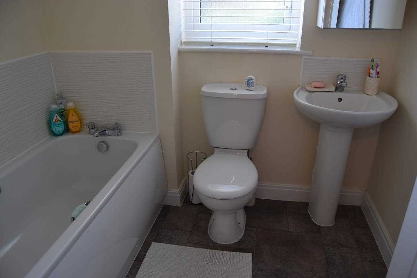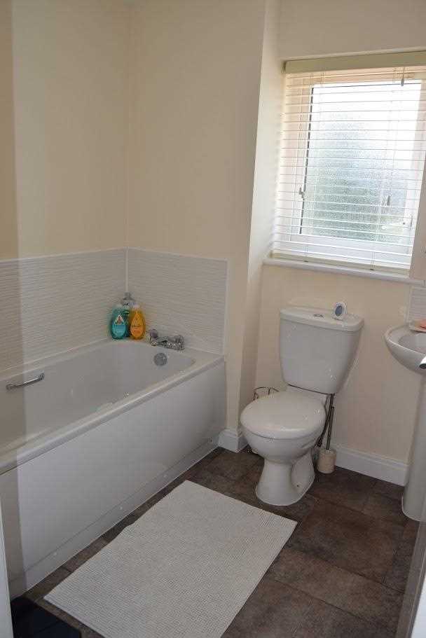 A good sized family bathroom position to the front elevation of the property. Single frosted glass Upvc unit. The bathroom has part magnolia walls and part white tiled walls around bath unit and sink unit. There is a white wc and sink basin. The flooring is brown linoleum.
