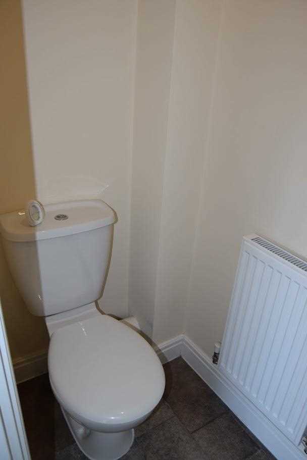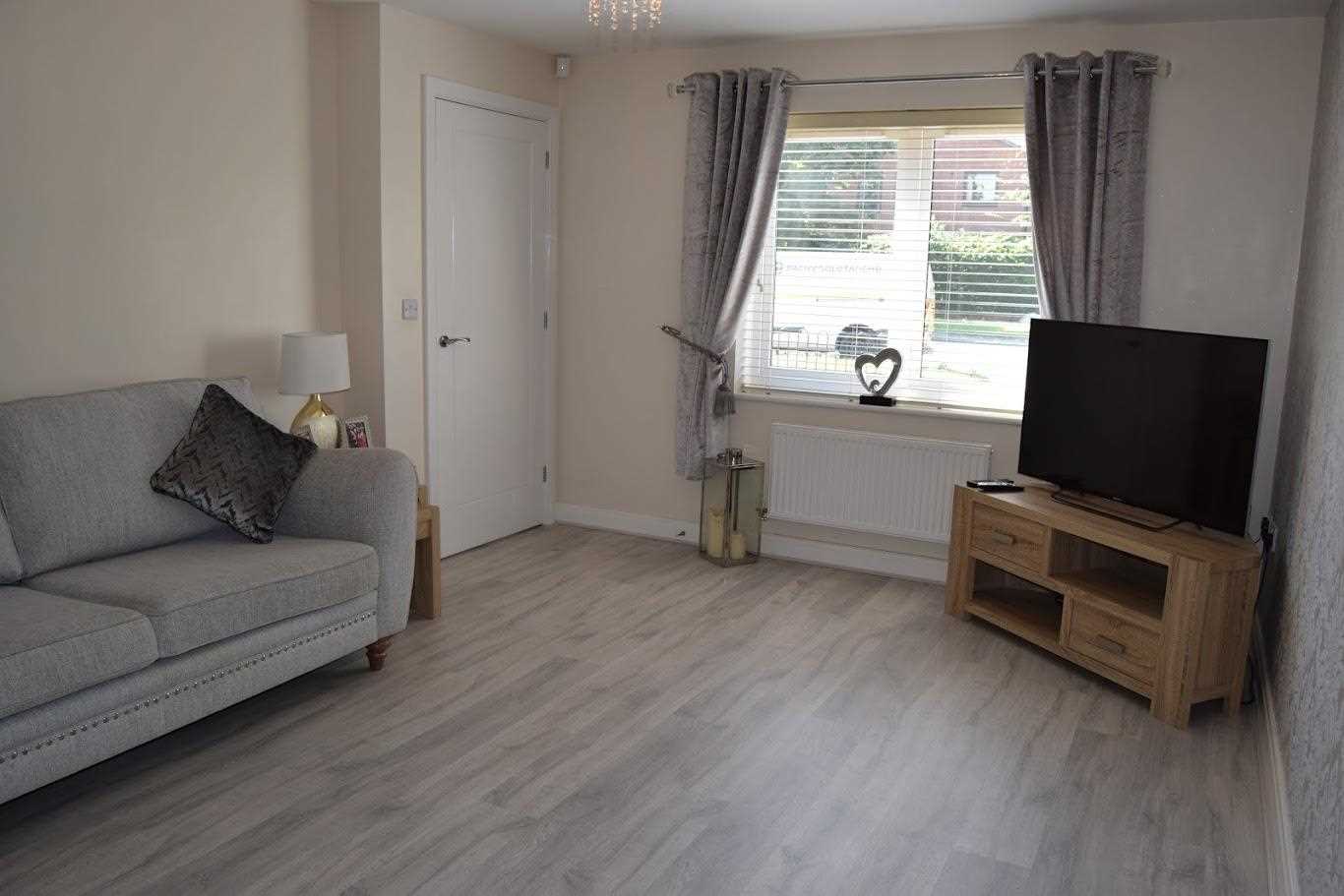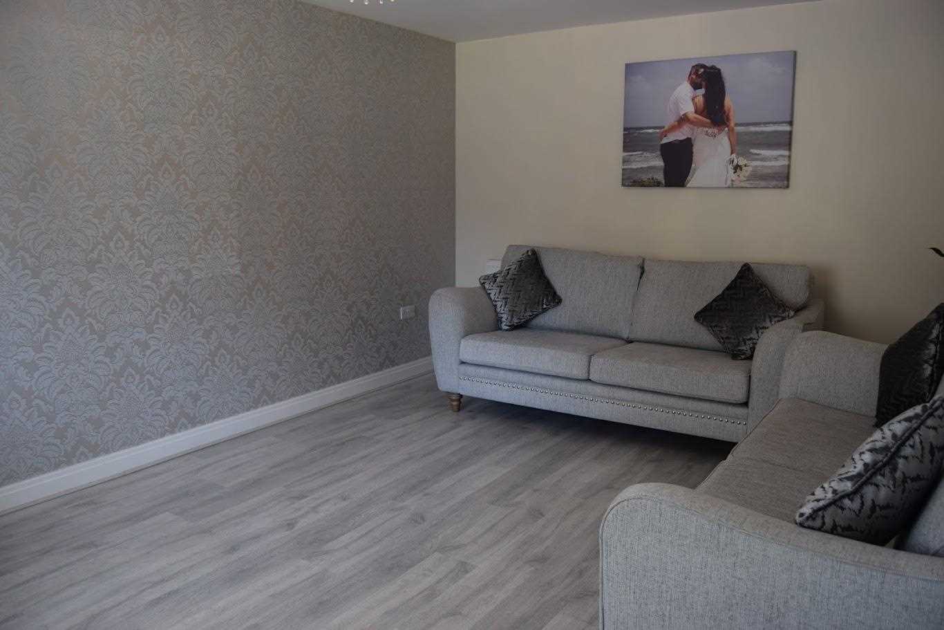The lounge is positioned at the front elevation of the property. Neutrally decorated with grey patterned wallpaper on main wall. The laminate flooring from kitchen/diner is continued through the hallway of this property and into the main lounge area also. A Upvc double glazed window looks out to front elevation. The room is warmed with double radiator. One bayonet light fitting. There is ample space for two three seater couches and tv unit and side table; and still allows plenty of space.