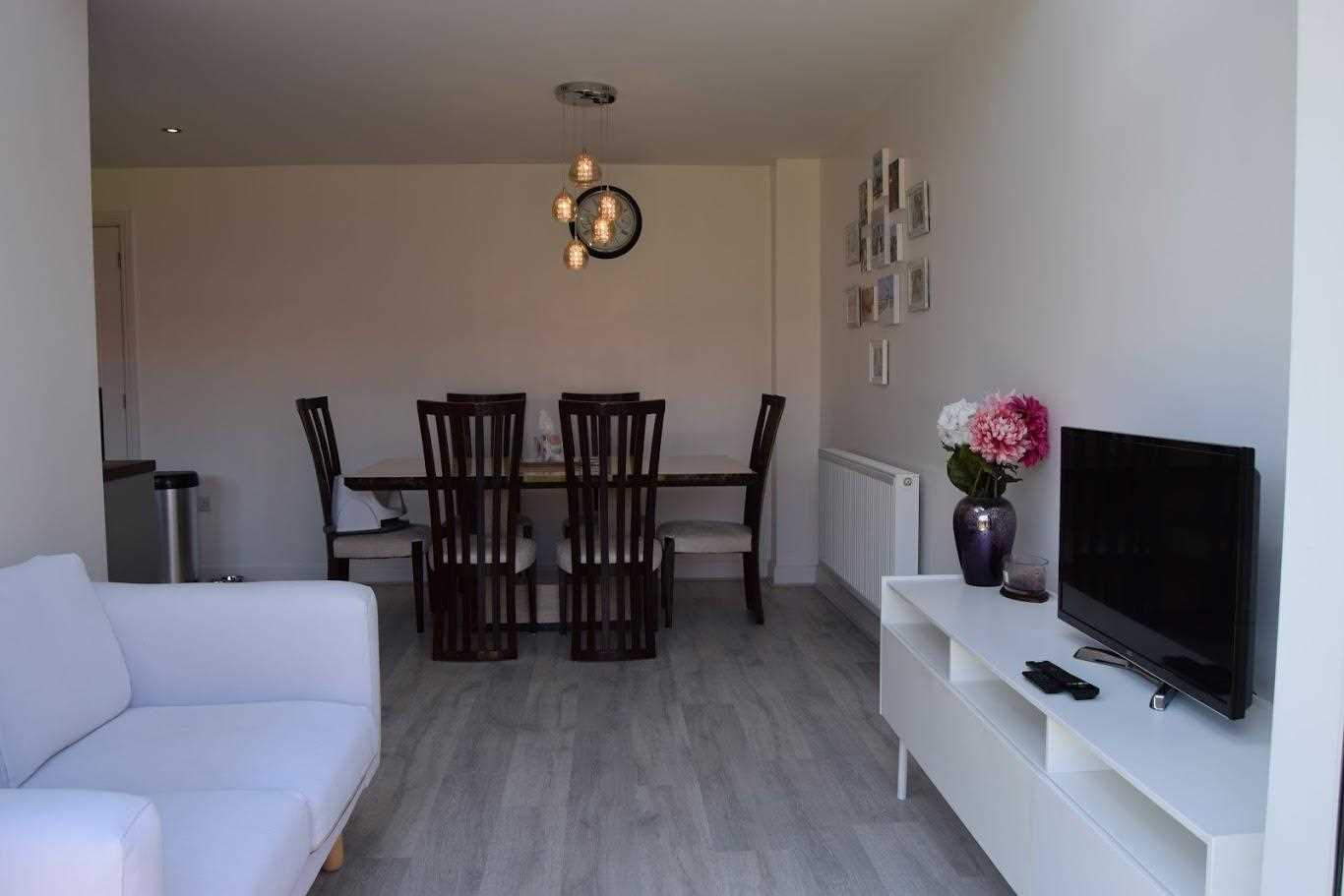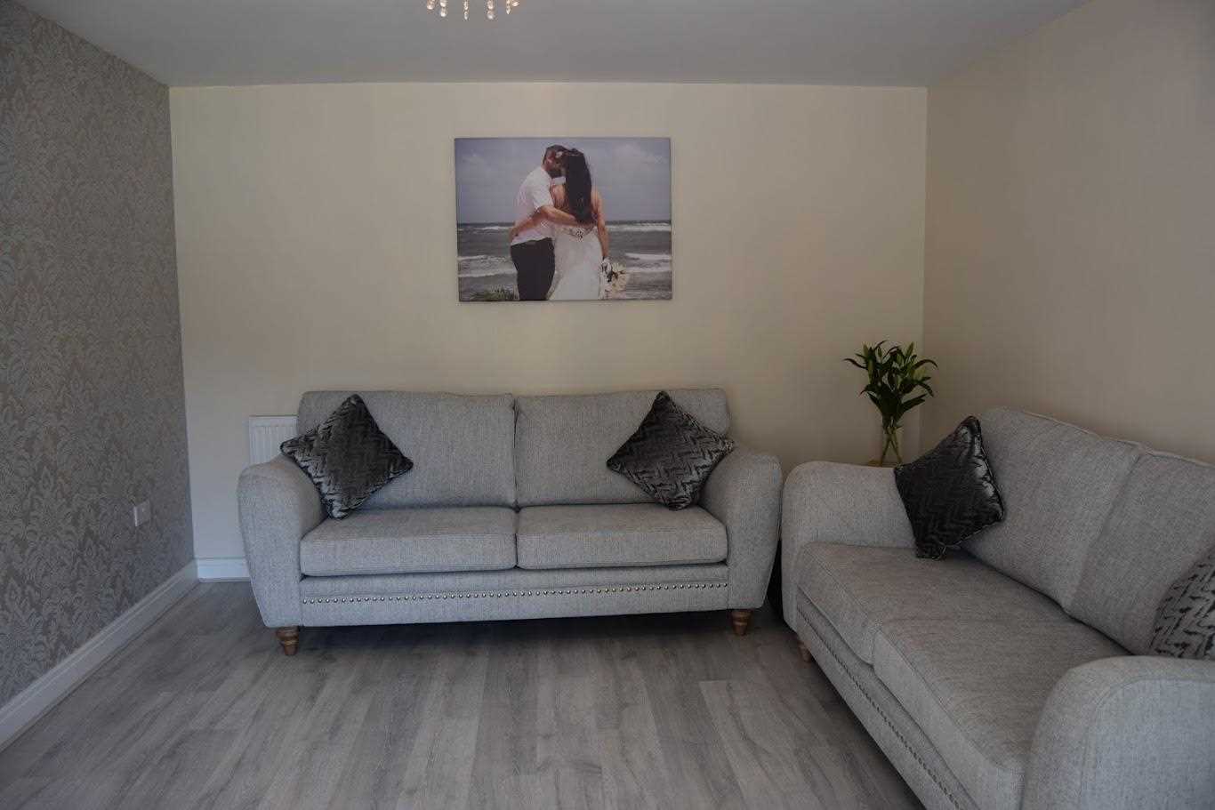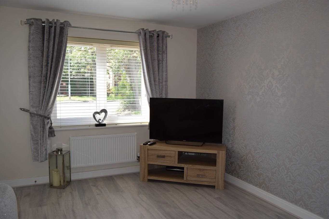 The lounge is positioned at the front elevation of the property. Neutrally decorated with grey patterned wallpaper on main wall. The laminate flooring from kitchen/diner is continued through the hallway of this property and into the main lounge area also. A Upvc double glazed window looks out to front elevation. The room is warmed with double radiator. One bayonet light fitting. There is ample space for two three seater couches and tv unit and side table; and still allows plenty of space.
