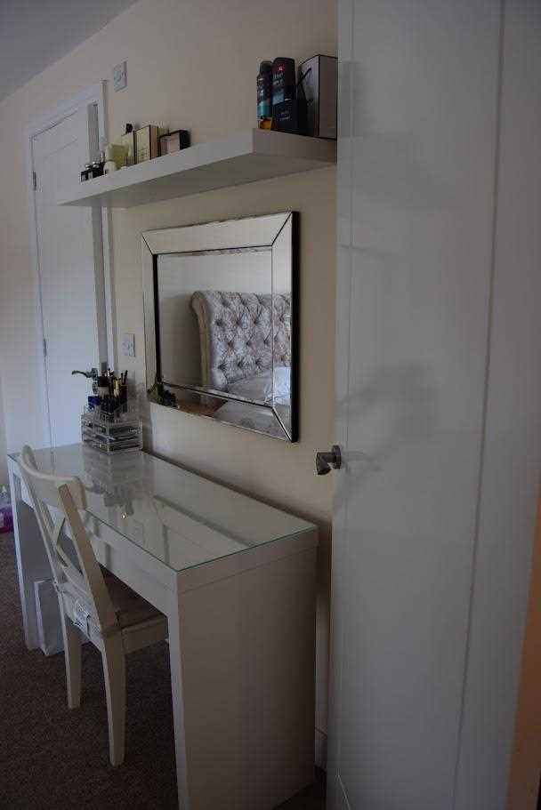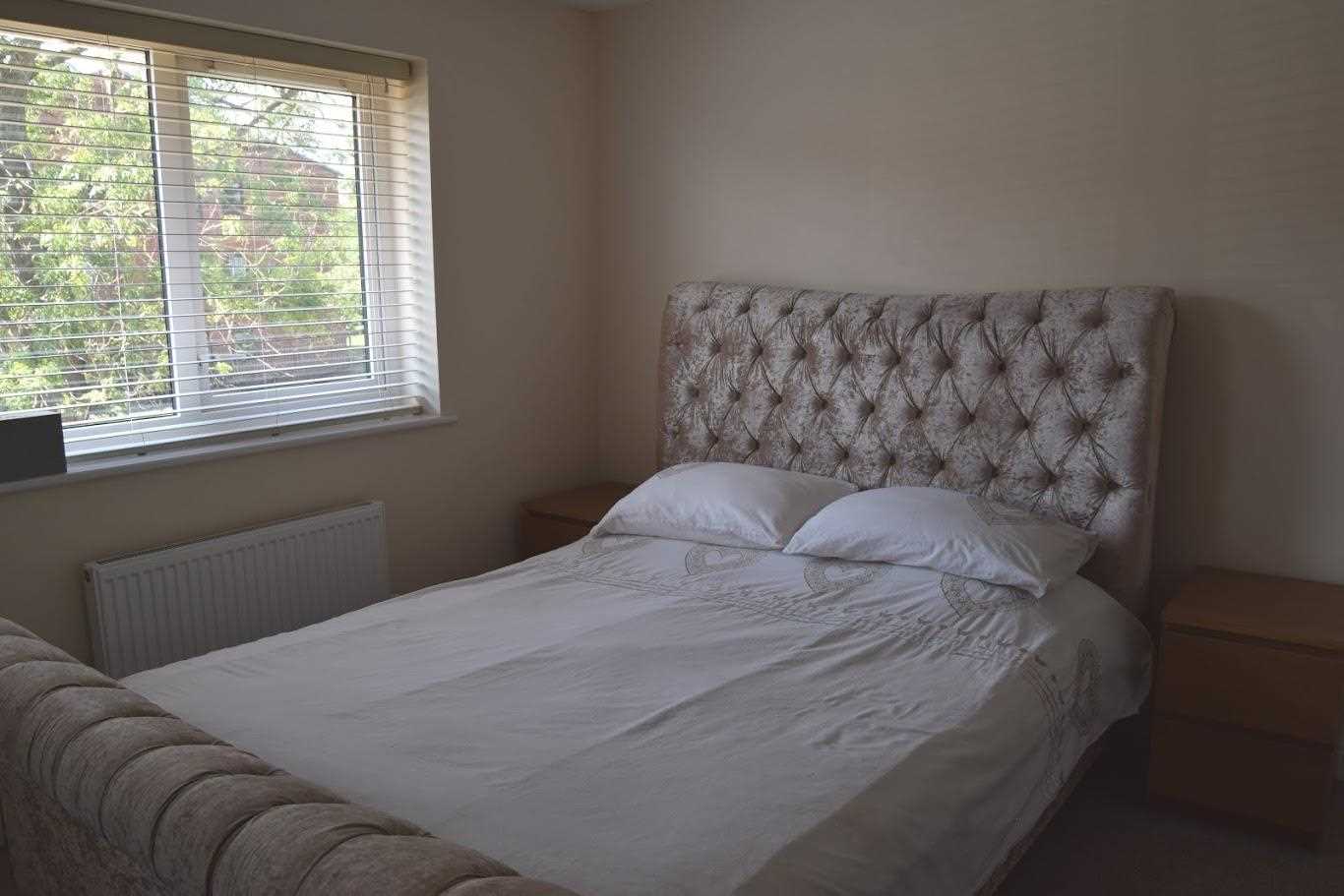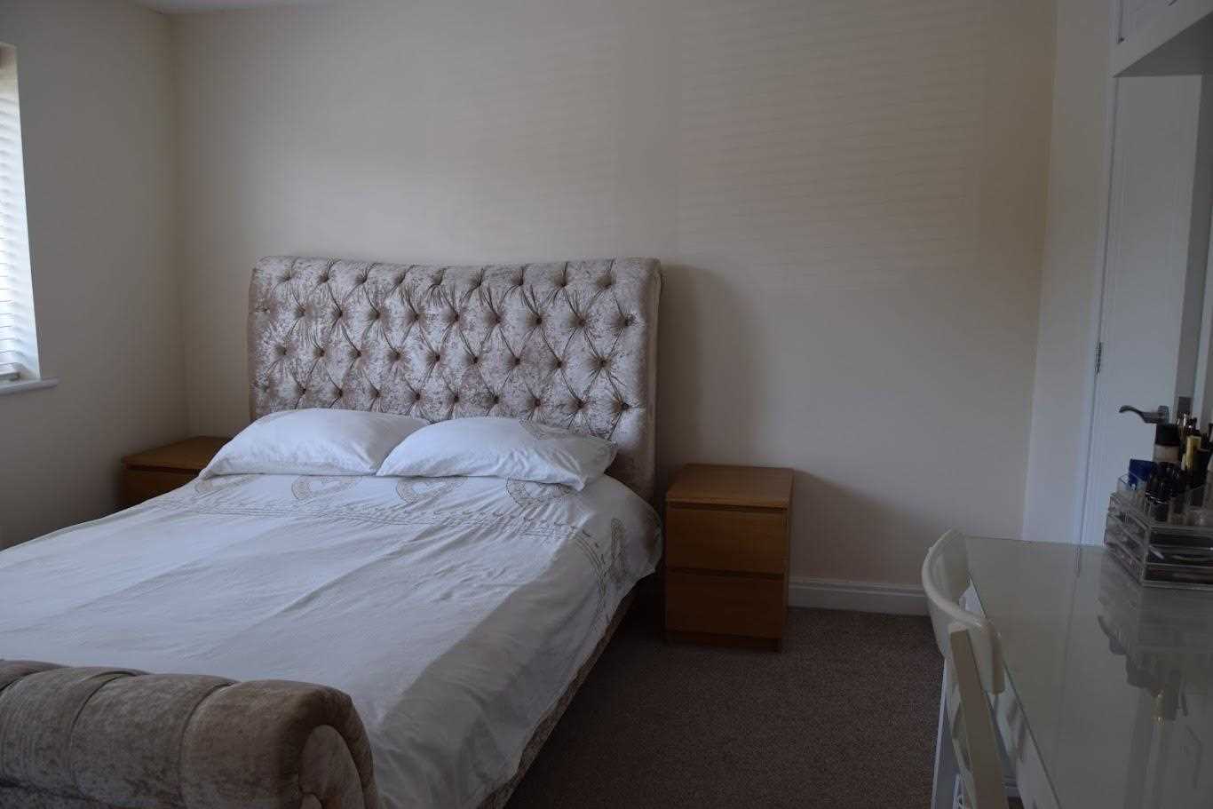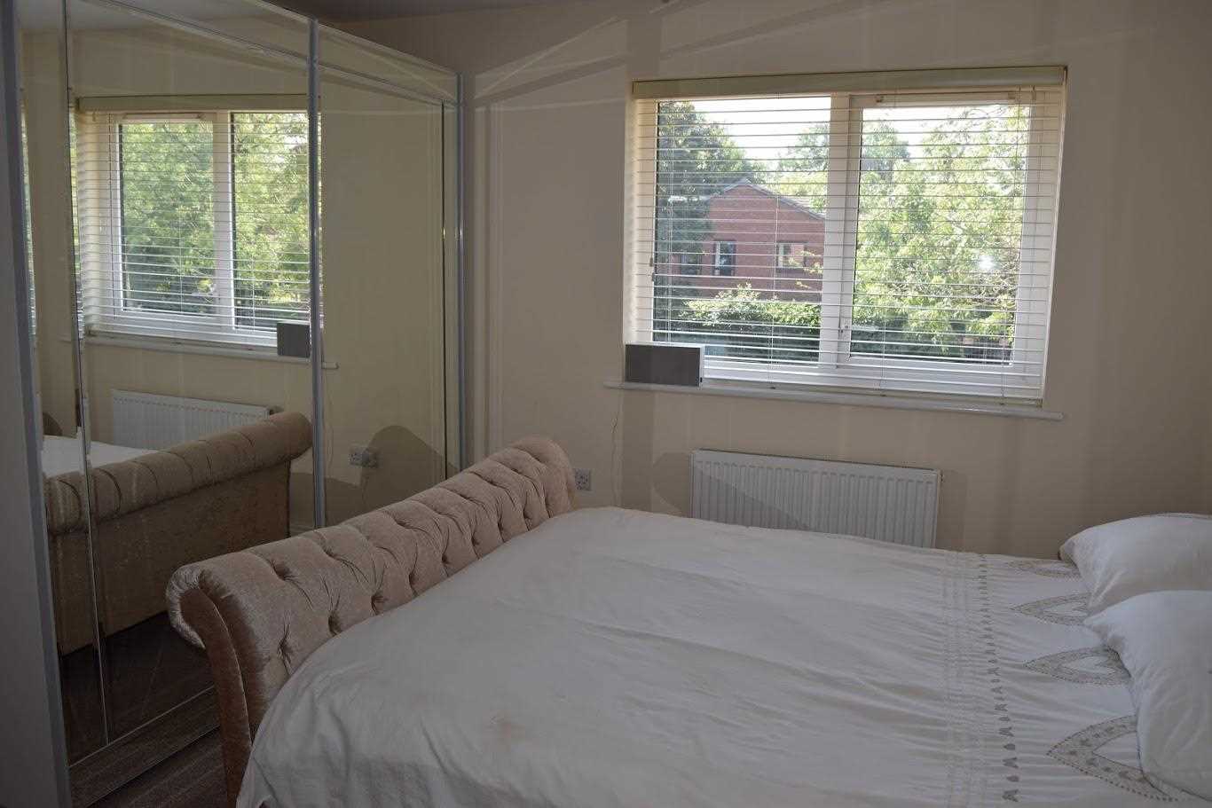 A good sized double bedroom. Front elevation of the property. UPVC double glazed window. Double radiator. This room has been neutrally decorated. The room have built in glass panelled sliding door wardrobes, providing plenty of storage for clothing. The bedroom has oatmeal coloured carpet which continues through the whole of the upstairs. A great bonus for this room is that there is an additional bathroom ensuite. The bedroom also had additional space for a dressing table.