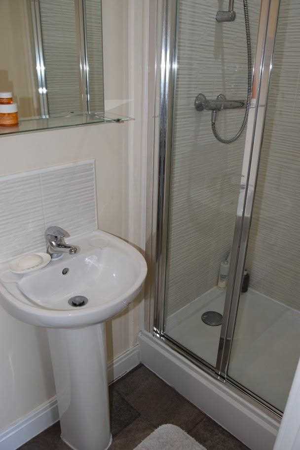 A nice sized ensuite with WC, sink unit and shower cubicle with shower. The flooring is a brown linoleum. Magnolia walls. White pattern split tile which has been used as a splash back to sink unit and also in shower cubicle. Silver plumbed shower unit. Small radiator.