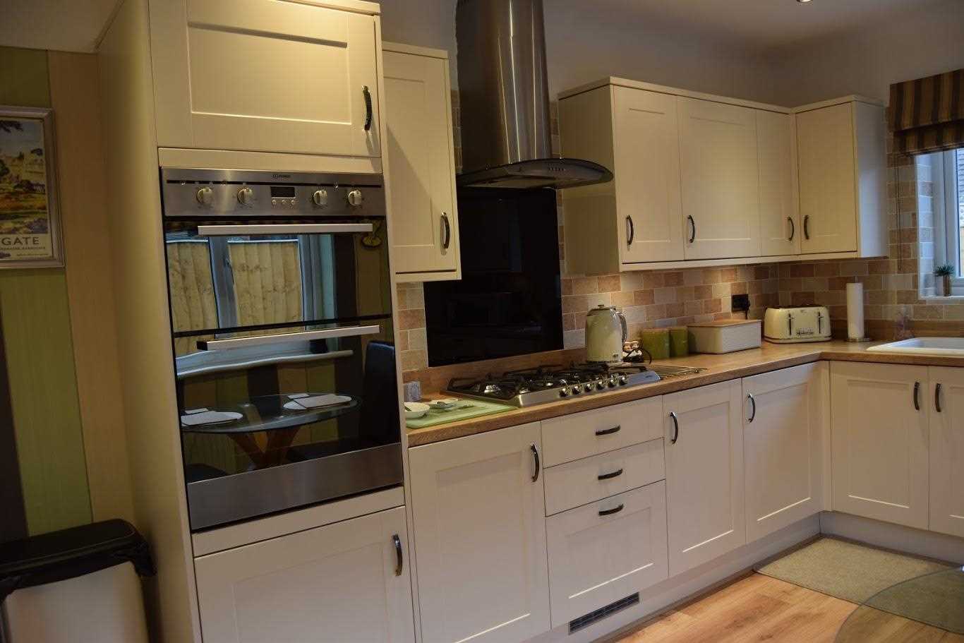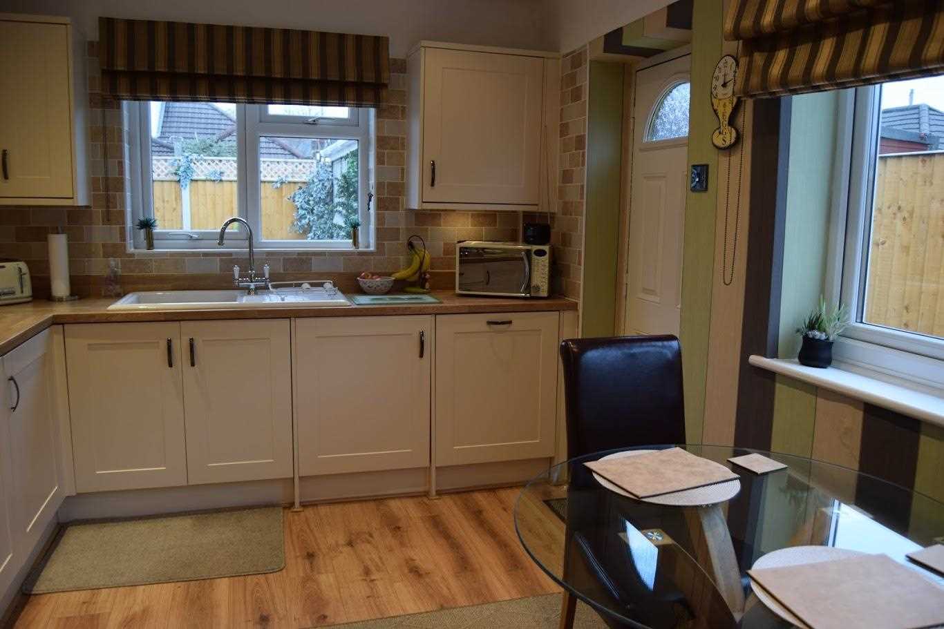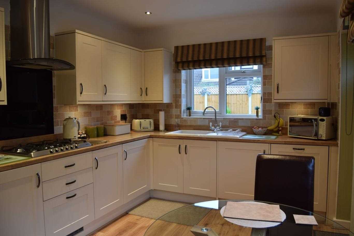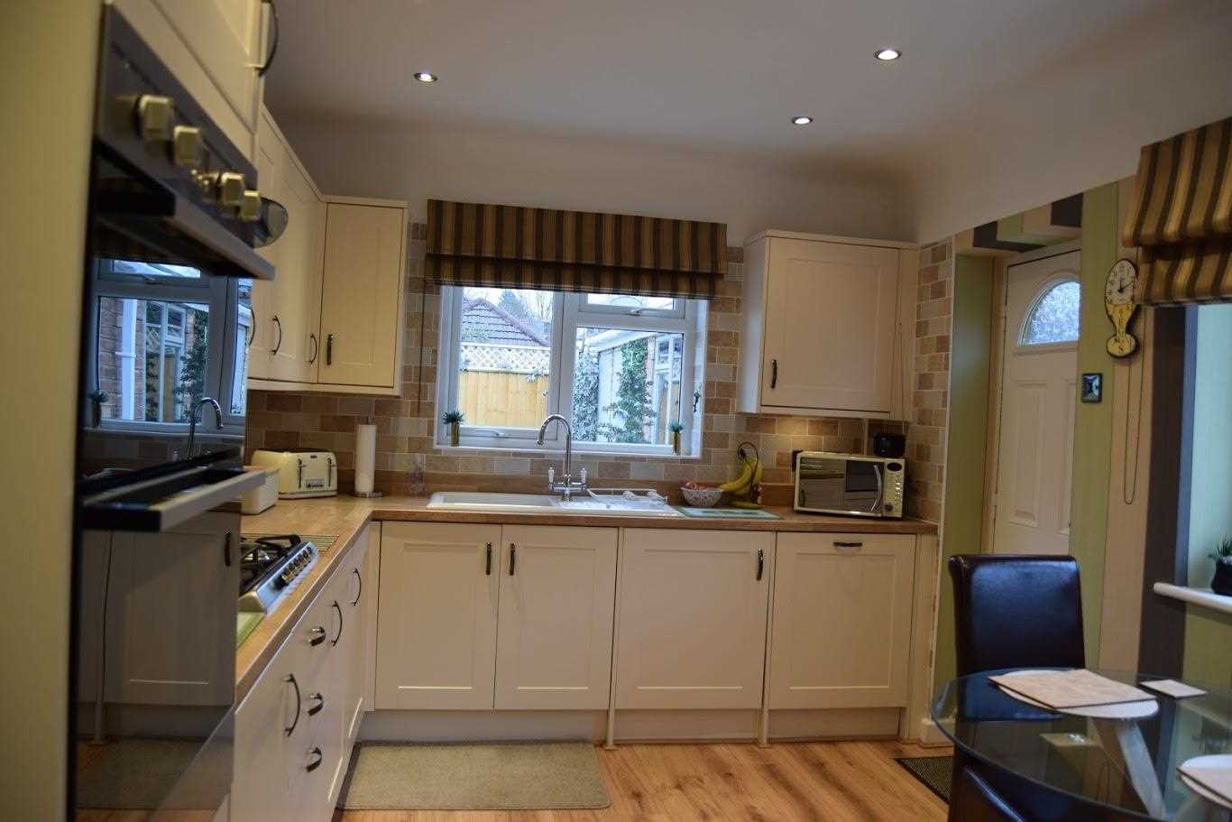 A large sized kitchen with space for four seater dining room table and chairs. The kitchen is a cream shaker style with butchers block worktop. The kitchen has plenty of work top space for any budding cooks. It offers a range of base and wall units with plenty of storage space. The dishwasher and washing machine are integrated and fridge/ freezer is offered in a tall larder unit as integrated appliances. There is a double oven with 5 burner gas hob. Behind the hob is a black glass splashback with overhead silver extractor fan. The kitchen has been part tiled and part decorated. There are spotlights which light up the room. A double radiator. The kitchen has a rear elevation double glazed unit and side elevation double glazed window. This allows an abundance of natural light through the property. There is access through the back door to the rear garden. For extra storage there is an additional larder unit. The Valiant boiler is housed in another separate larder unit. The flooring is laminate which flow throughout the property.