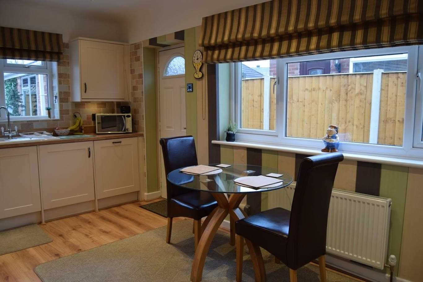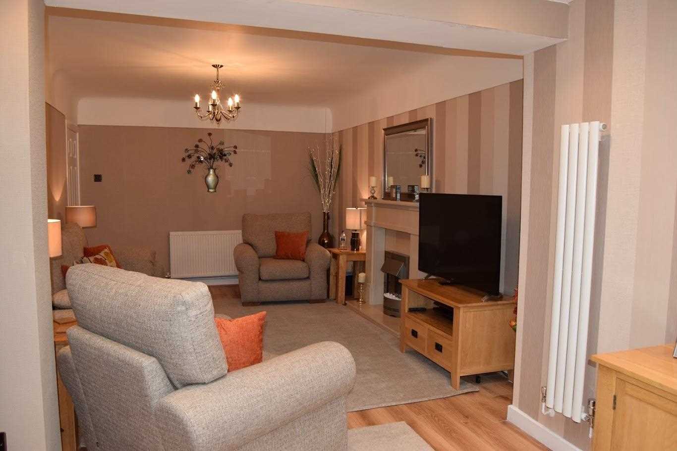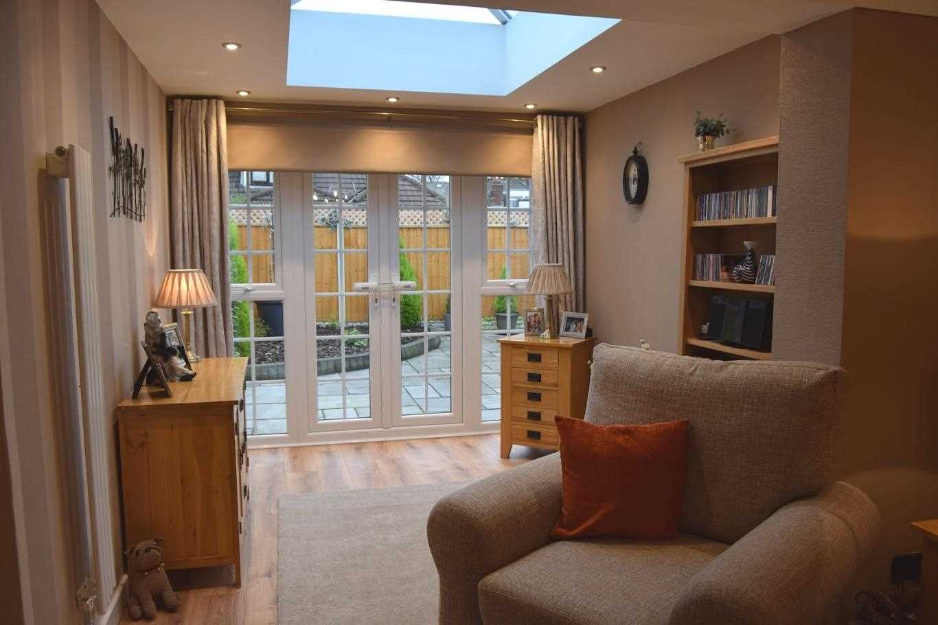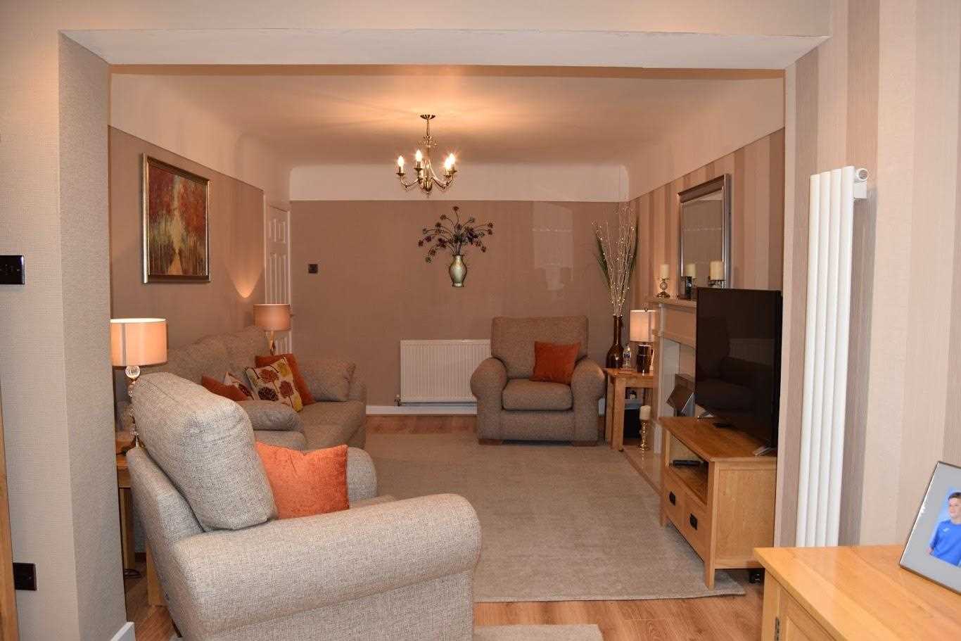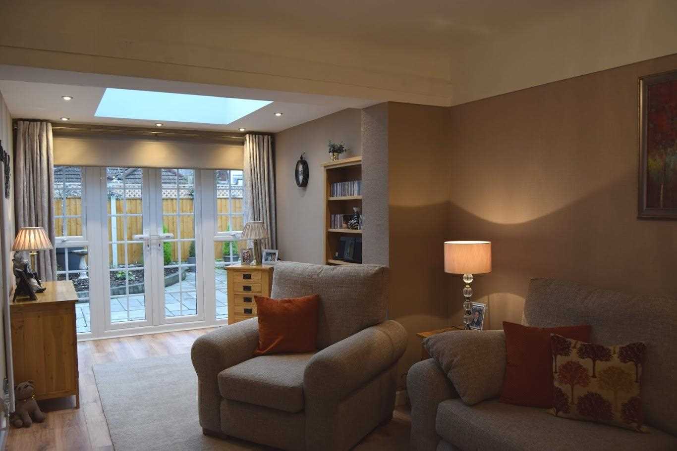 A large living area leading to extended dining area. This room as neutrally been decorated with wallpaper. The room is very light. The extension benefits from natural light which comes through french doors and a beautiful lantern roof. There are two window openers either side of the french doors. Laminate flooring continues through this room. There is a bayonet light fitting with spotlights in the extension area are the lantern roof. Electric fire with feature cream surround. The room is warmed with a trendy tall white radiator and a double radiator. An exceptional space.