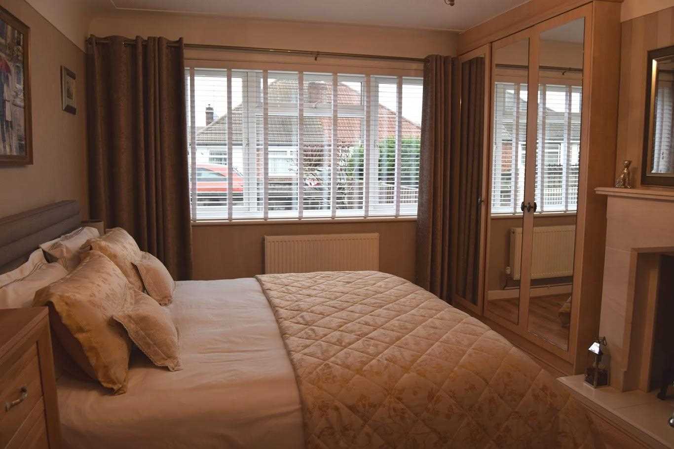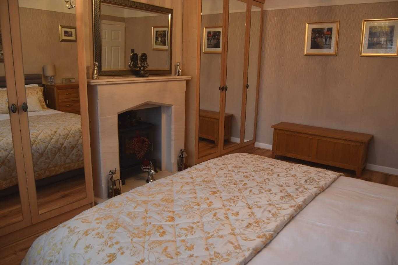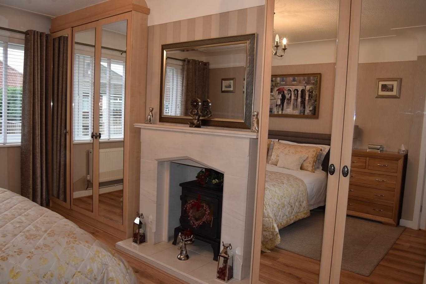 A large master bedroom with front elevation. Double glazed windows. Double radiator. Built in mirrored wardrobes which give a perfect "him and hers" space. There is a log burner with decorative surround. Decorated neutrally with wallpaper. The floor continues in this room which has flowed through the whole house. Bayonet light fitting with shade.