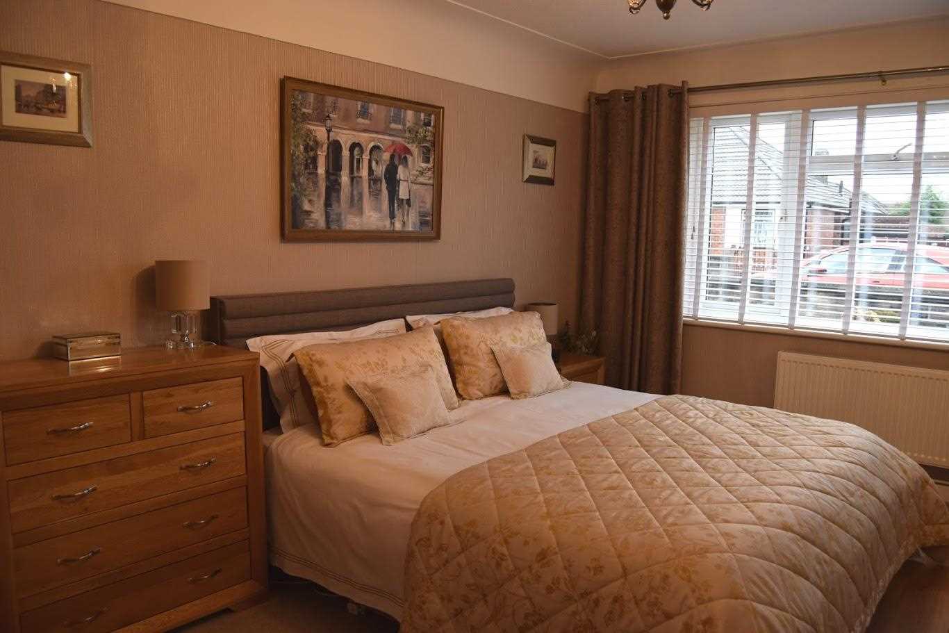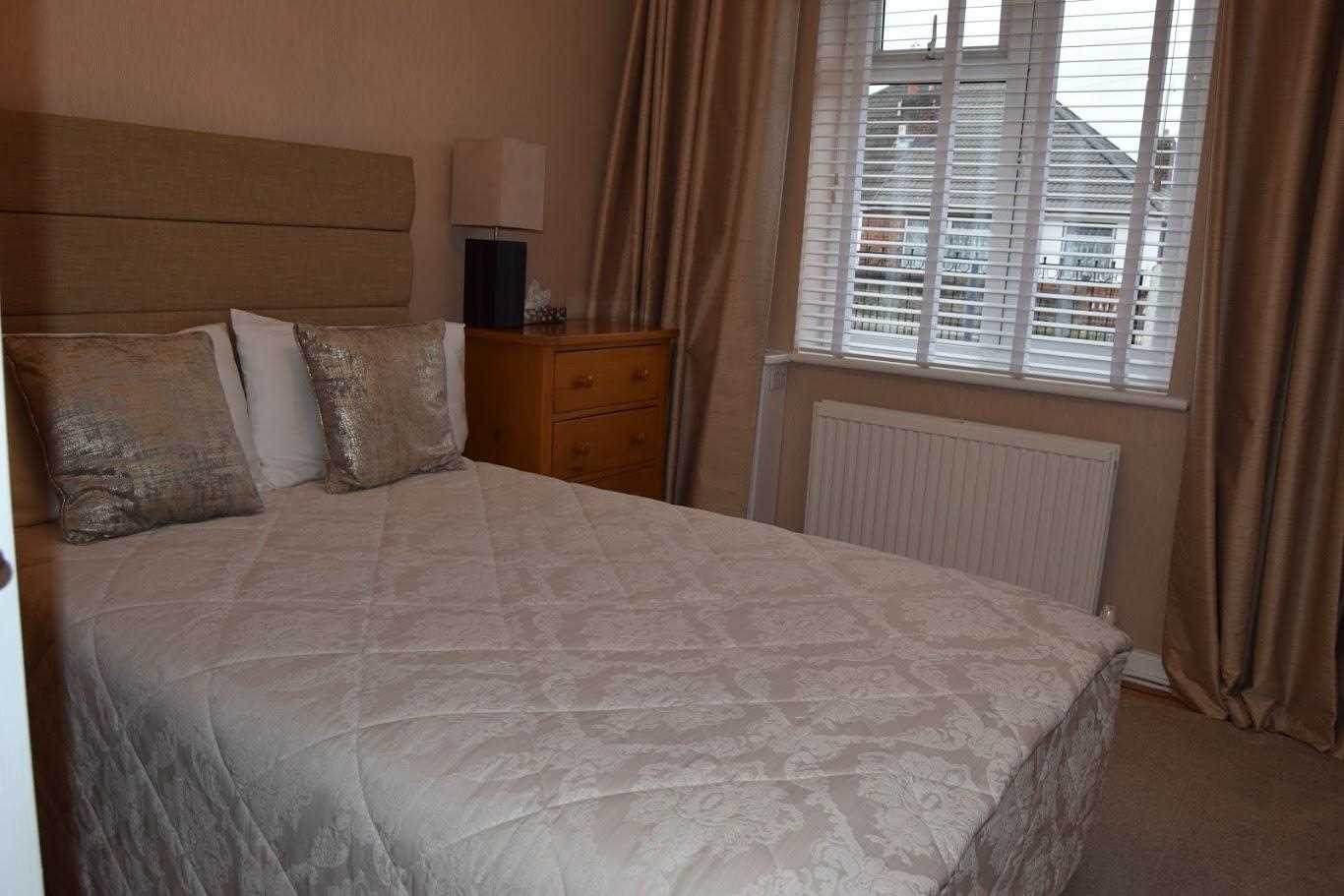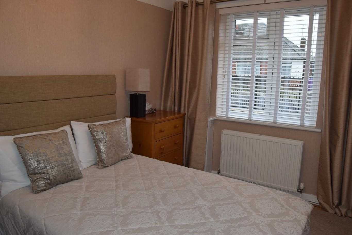 A large master bedroom with front elevation. Double glazed windows. Double radiator. Built in mirrored wardrobes which give a perfect "him and hers" space. There is a log burner with decorative surround. Decorated neutrally with wallpaper. The floor continues in this room which has flowed through the whole house. Bayonet light fitting with shade.