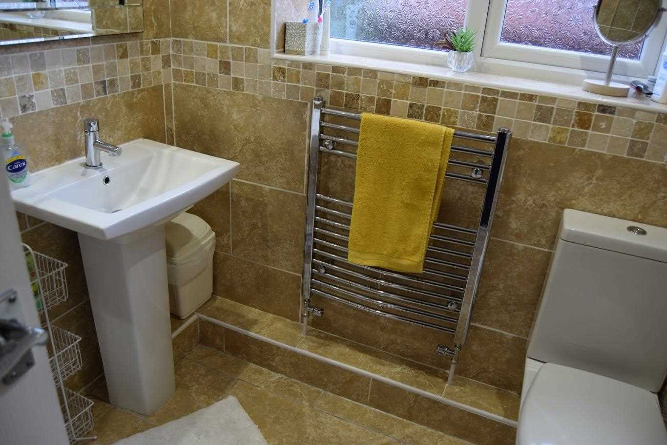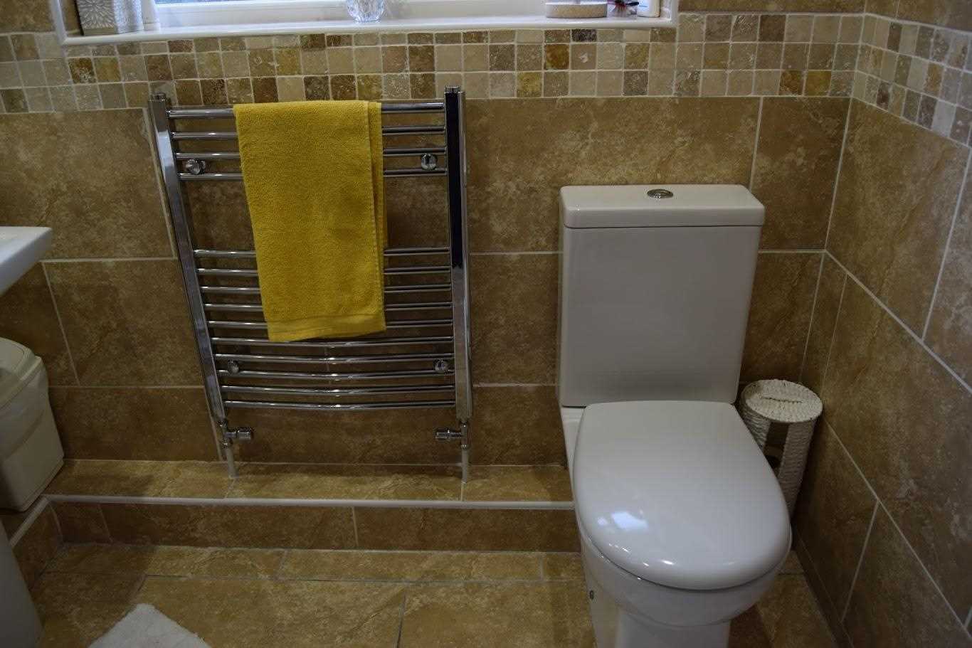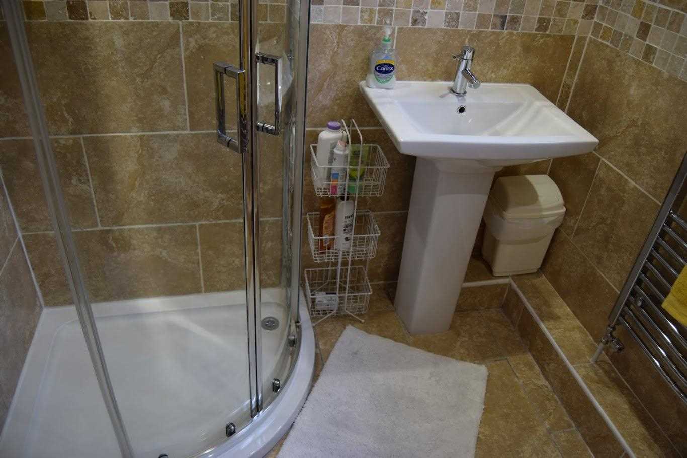 Fully tiled floor to ceiling beige tiles with pattern design border. Large free-standing shower unit with electric shower. This has double sliding glass door. WC and white sink unit. Side elevation frosted glass window. Plumbed towel rail.