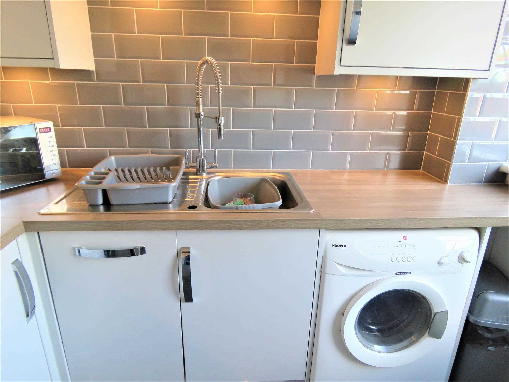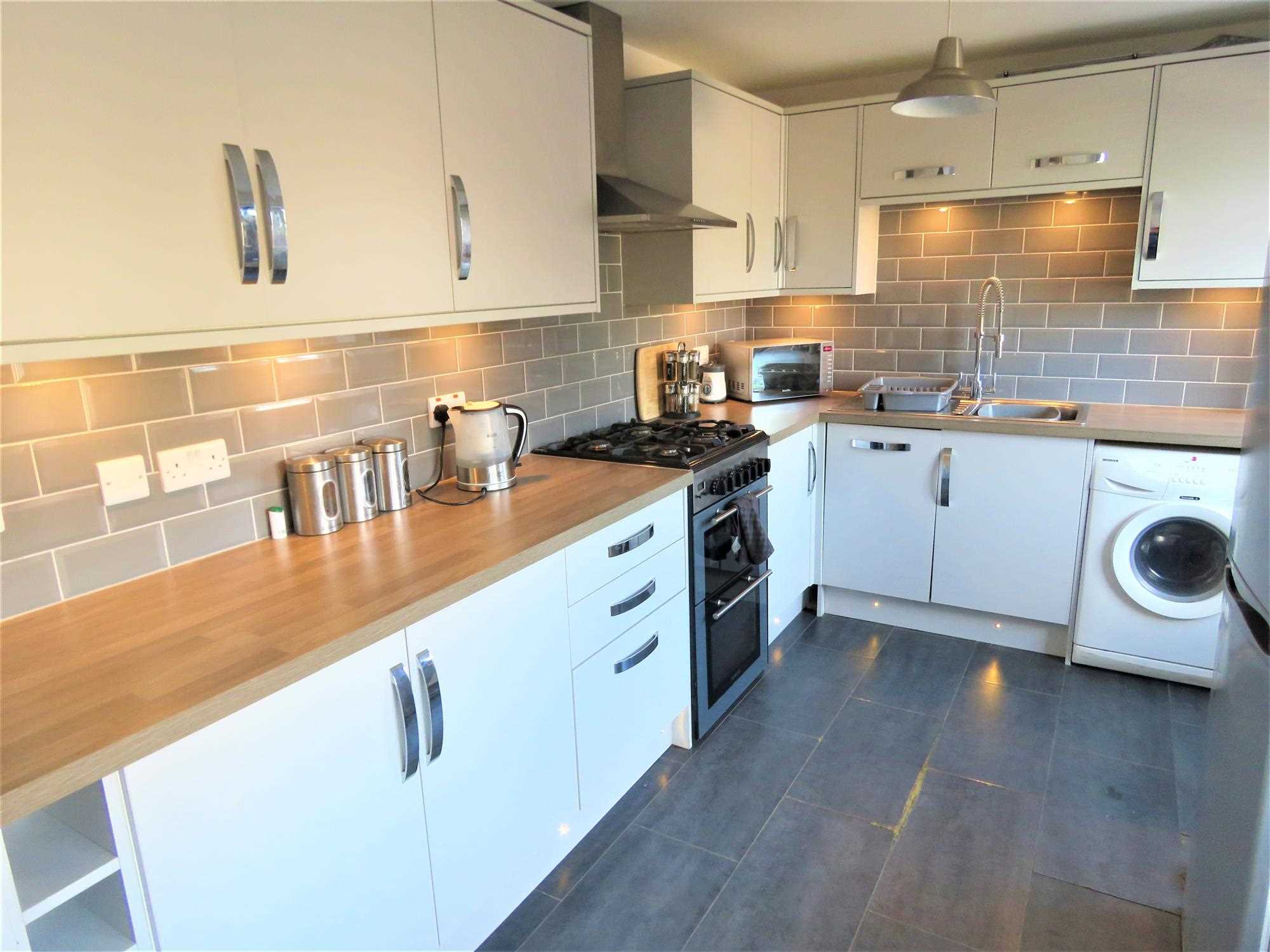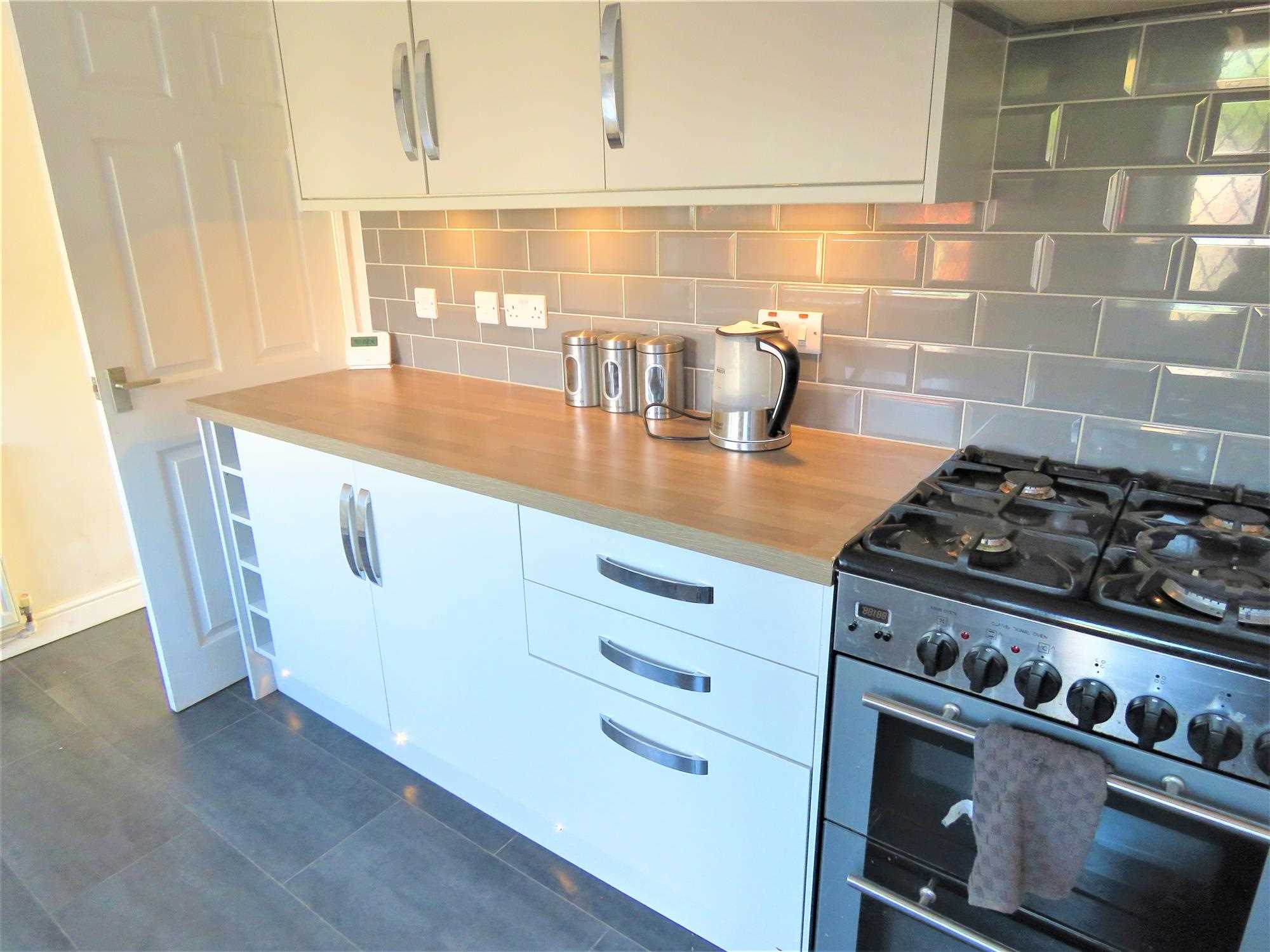 A spacious modern kitchen/Diner. Rear access through to the garden through a UPVC back door and a large double glazed upvc window in the dinning section with views onto the rear garden area. Mix of wall and base units in white gloss. With railway tiled splashback and feature lighting to accentuate the modern kitchen. Free standing oven/grill and gas burner hob. Space plumbed for washing machine and space for free standing fridge/freezer. Overhead silver extractor fan. Sink unit with modern spray mixer tap in holder. Wood chop board square edge laminate work top. This kitchen is spacious enough for table and chairs for family dinning. Lino flooring in grey colour.