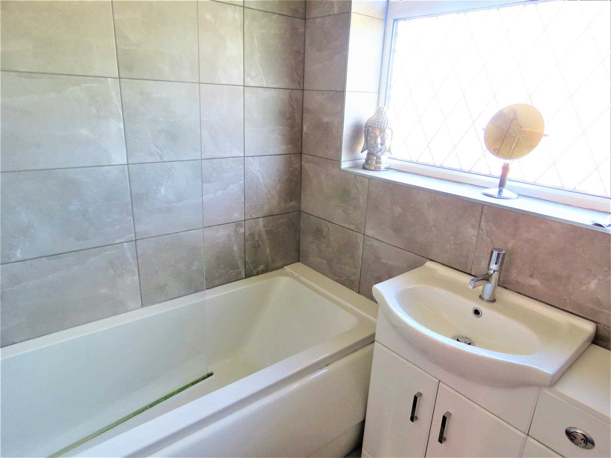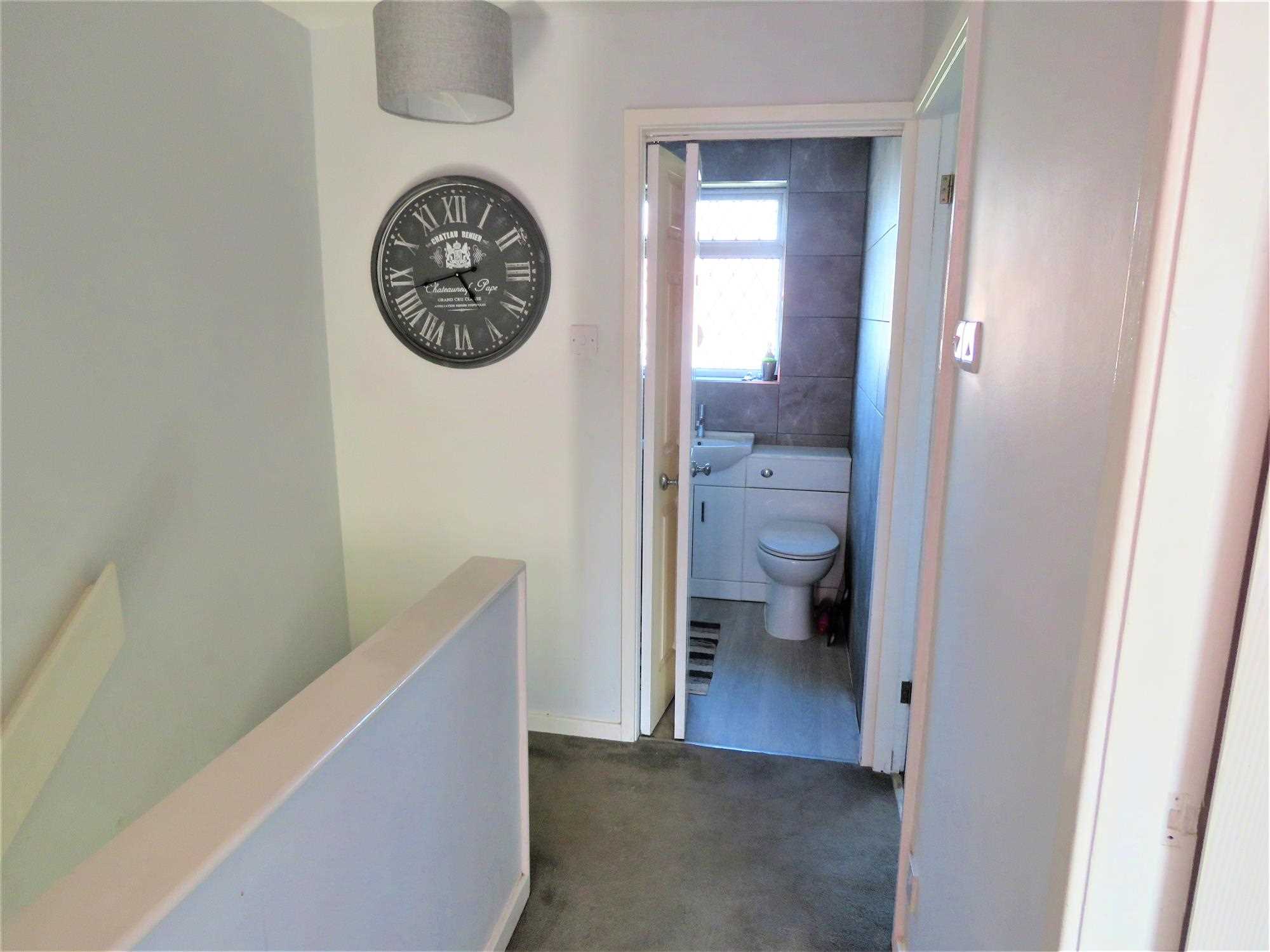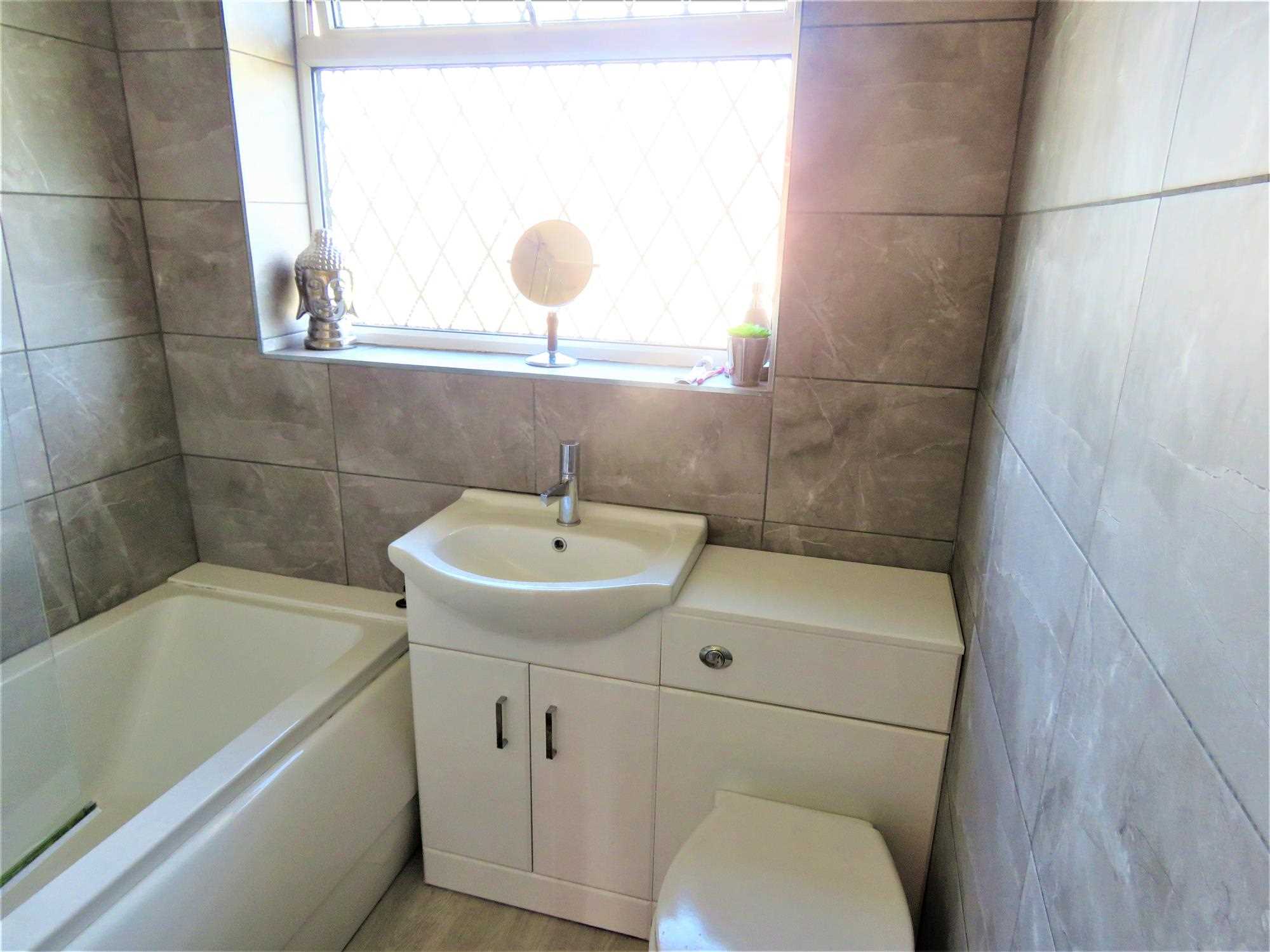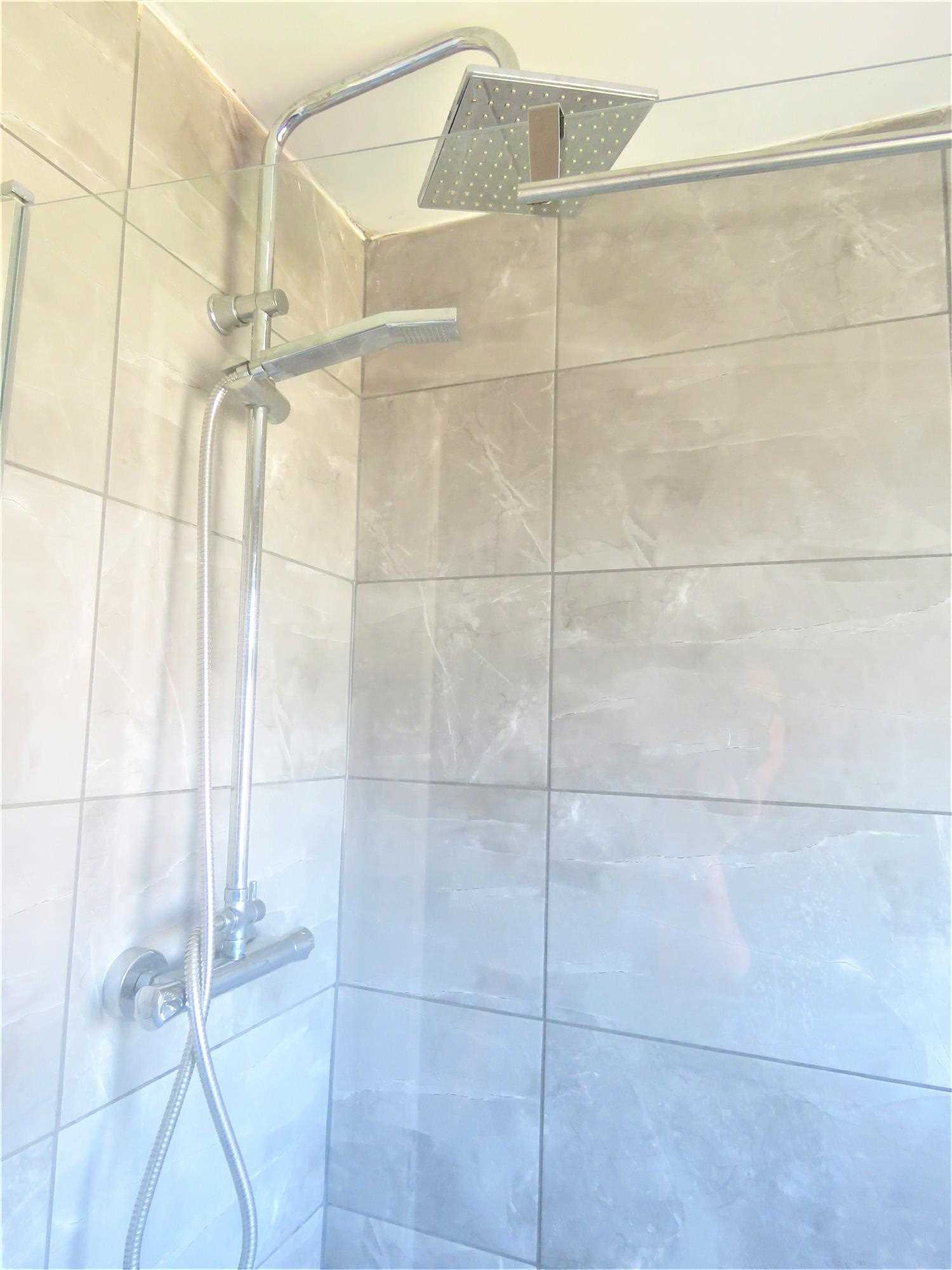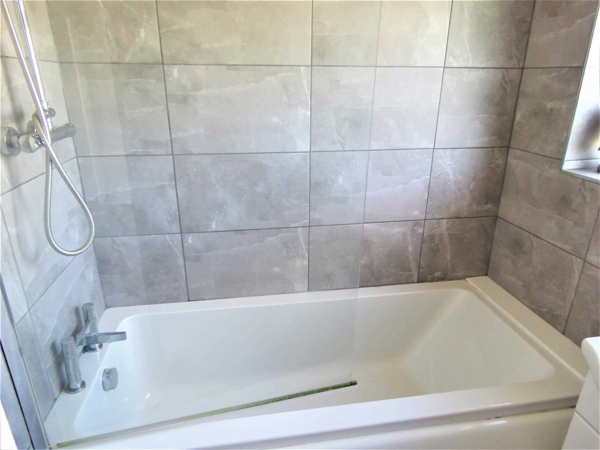 Wowweee what a lovely bathroom. Stylish floor to ceiling grey tiles with stunning waterfall shower which is plumbed into the central heating. Sink in vanity unit in white with under sink storage. Built in white toilet. large upvc double glazed frosted glass window and located at the rear of the property. Good sized bath. Lino grey flooring to match.
