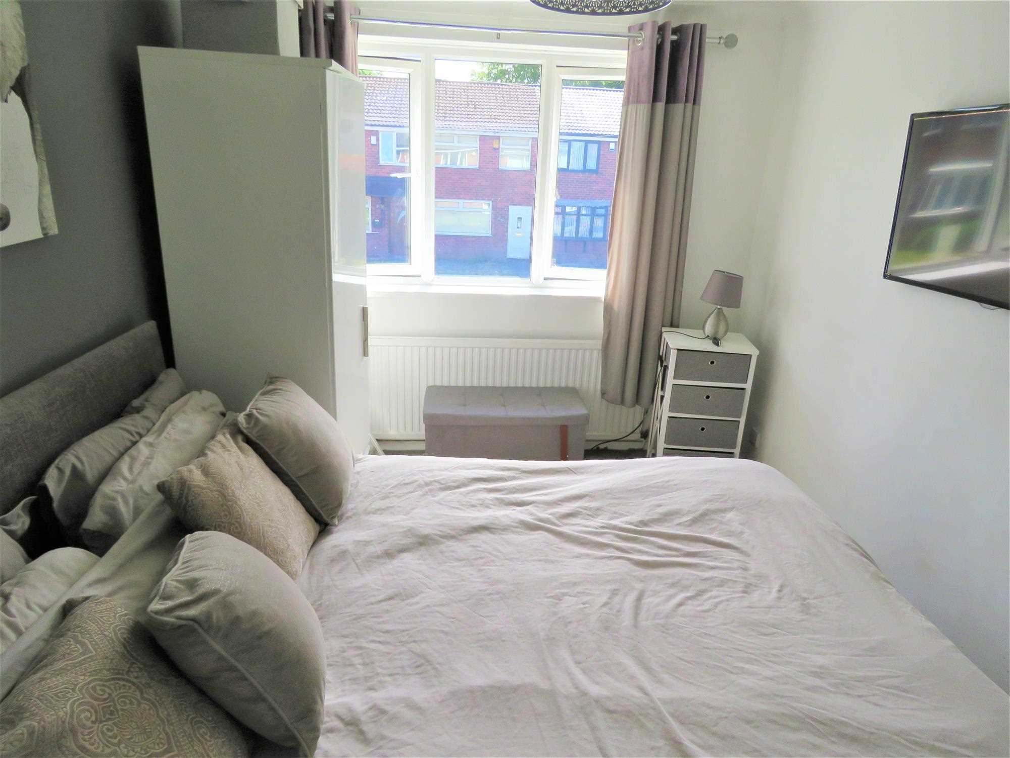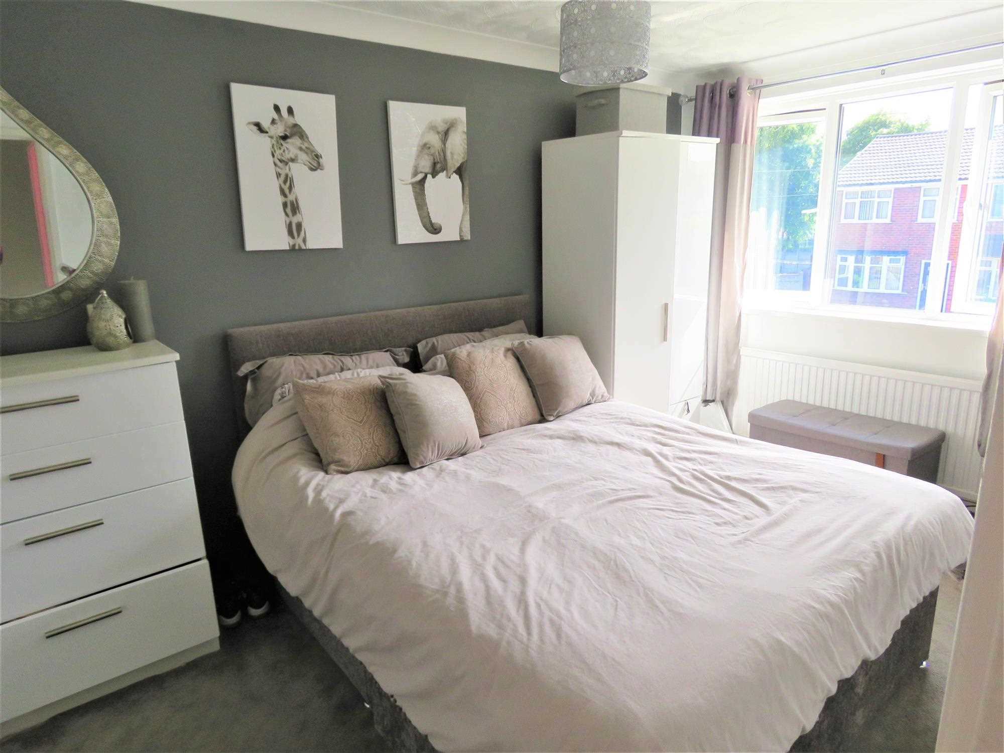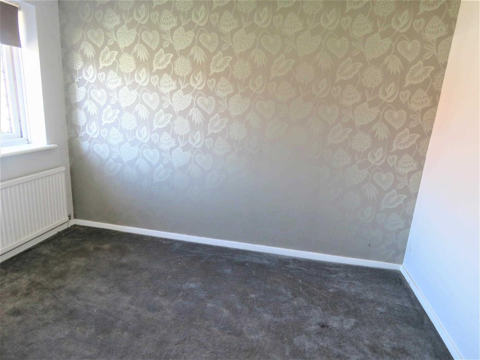 A good sized second double bedroom. Grey carpet flooring and white walls with feature wallpaper. Warmed with a double radiator and rear views onto the garden area. Upvc double glazed windows.