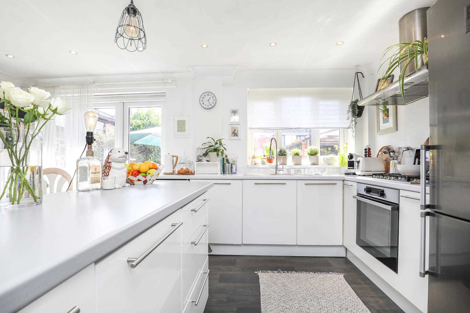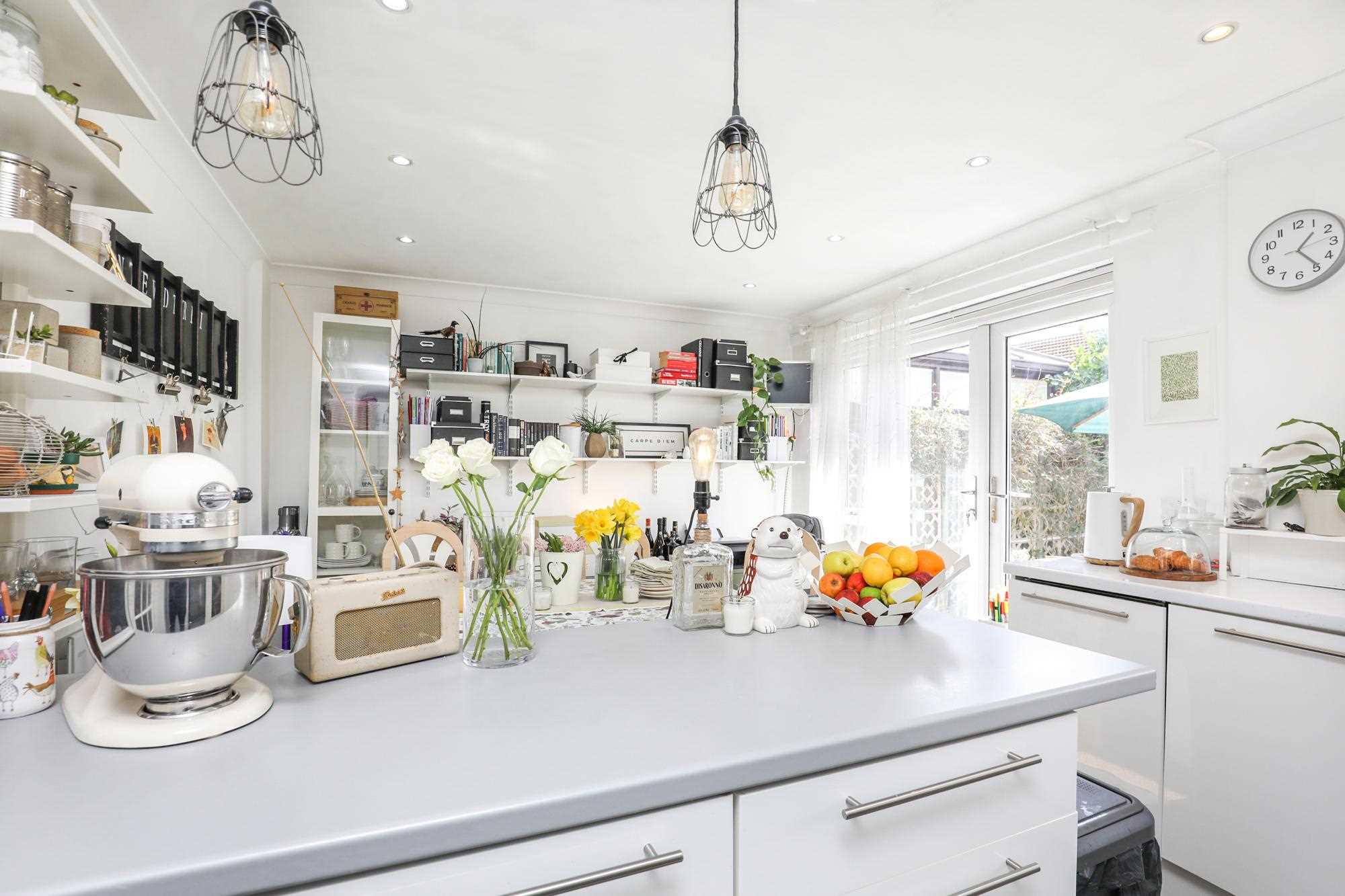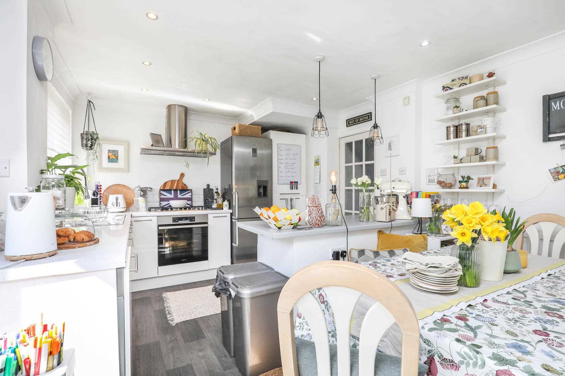 Plenty of storage base units. Plumbed for washing machine and dishwasher. Integrated oven and gas hob. Breakfast bar which offers additional base unit storage. Mix of pendant light fittings and spotlights light up this space. Open plan kitchen and dining. A real family hub of the house. Really light room with views out the window to the garden and french doors to lead out. Linoleum flooring. White kitchen. Space for free-standing fridge freezer. Extractor fan over hob.