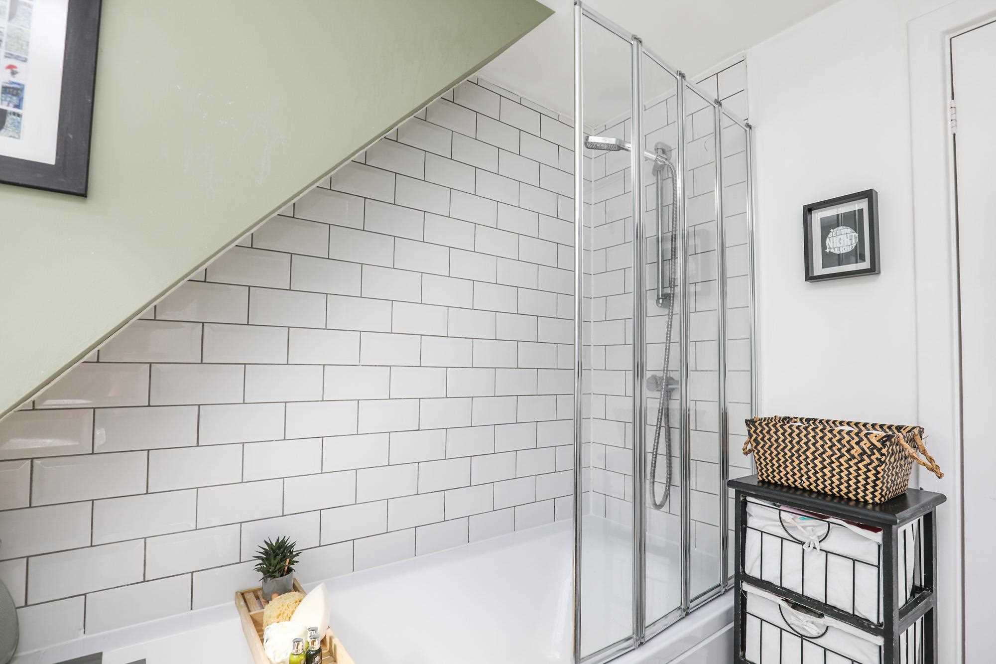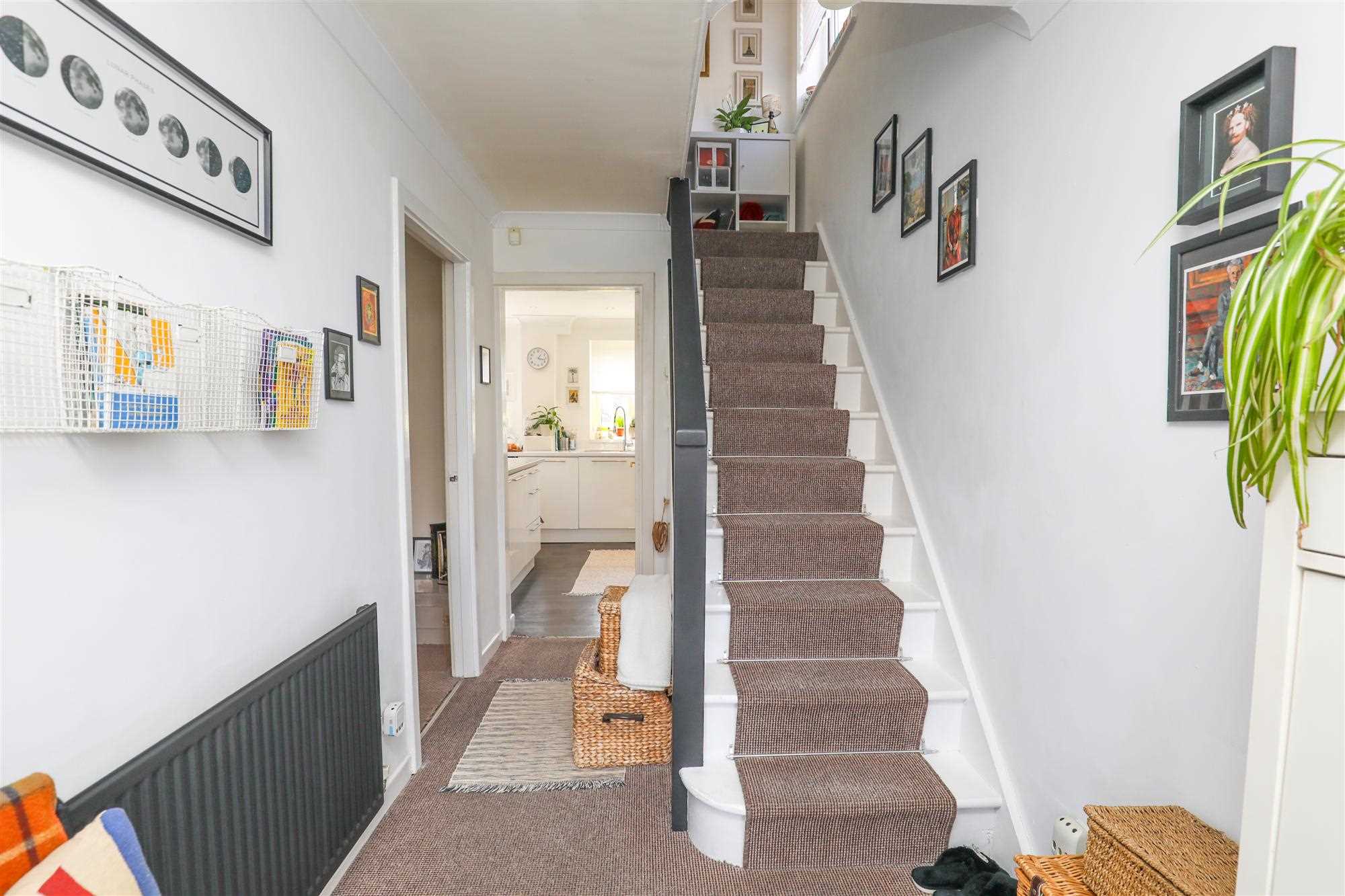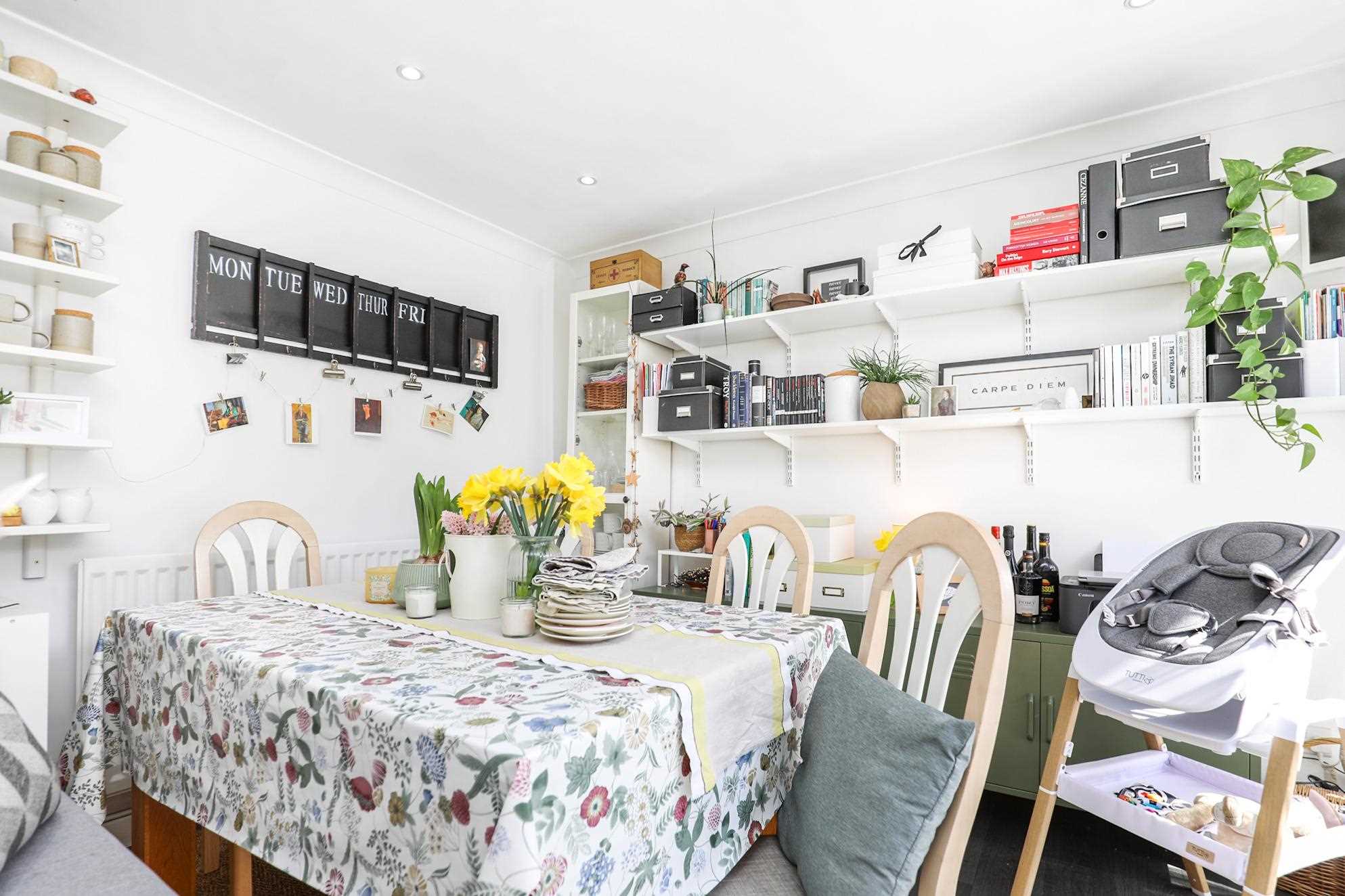 Plenty of storage base units. Plumbed for washing machine and dishwasher. Integrated oven and gas hob. Breakfast bar which offers additional base unit storage. Mix of pendant light fittings and spotlights light up this space. Open plan kitchen and dining. A real family hub of the house. Really light room with views out the window to the garden and french doors to lead out. Linoleum flooring. White kitchen. Space for free-standing fridge freezer. Extractor fan over hob.
